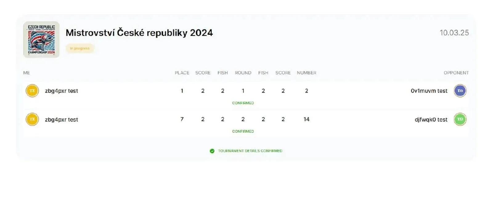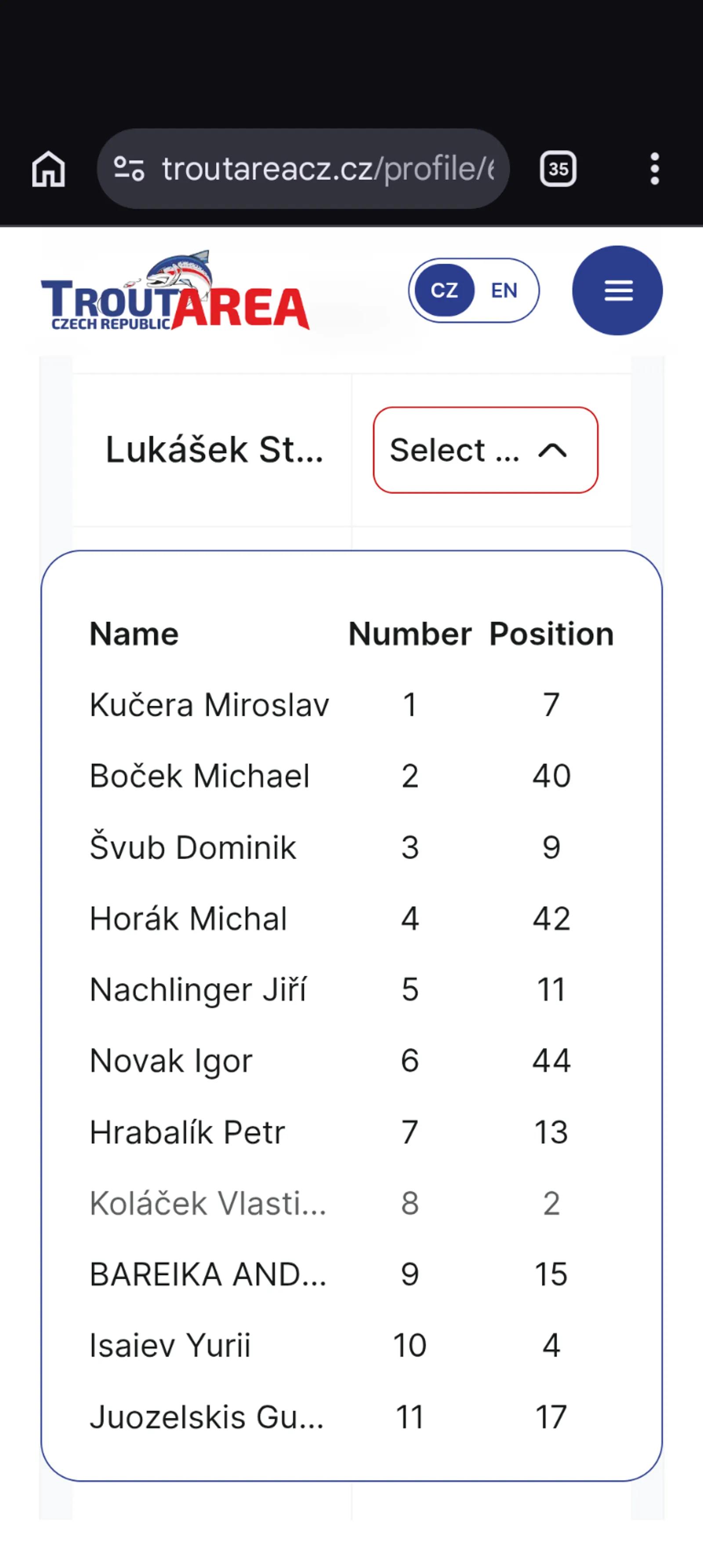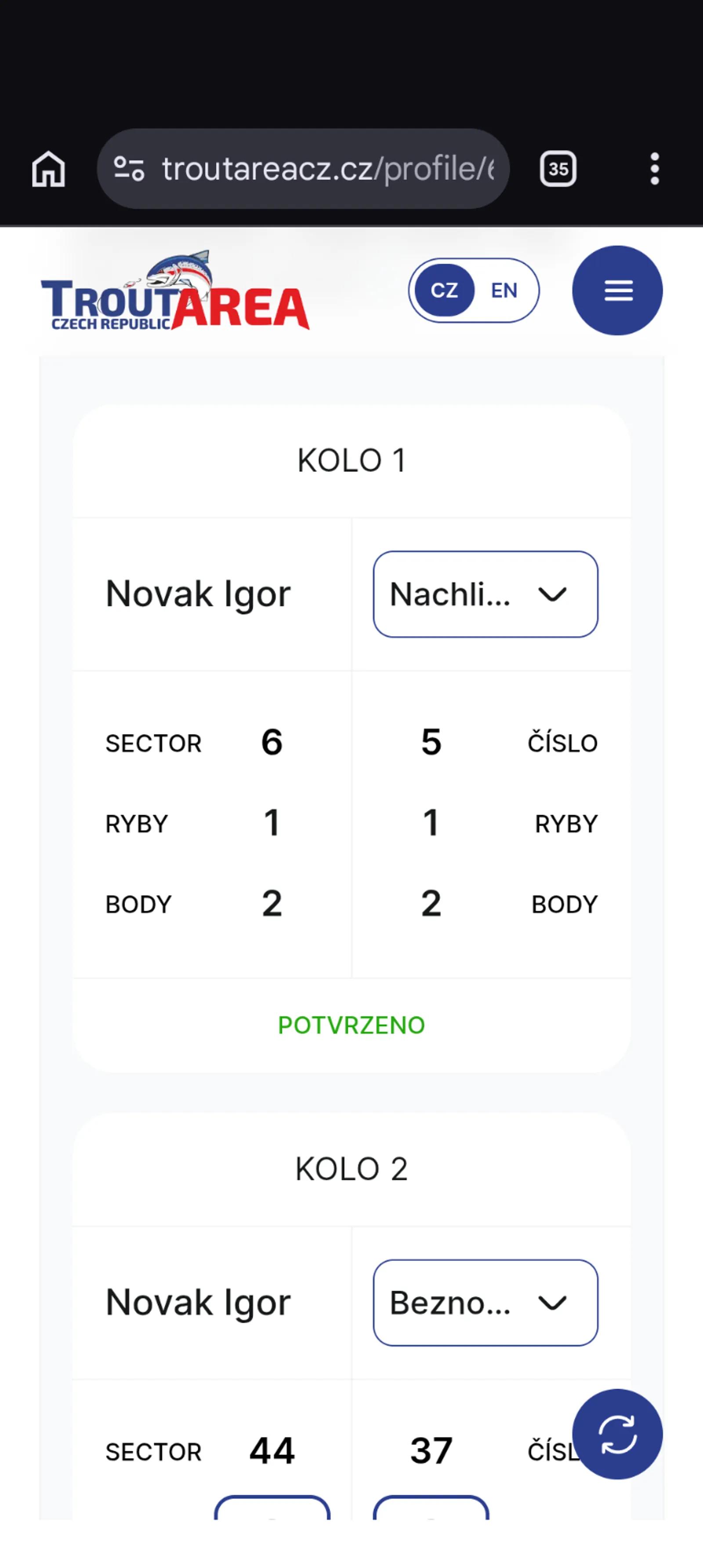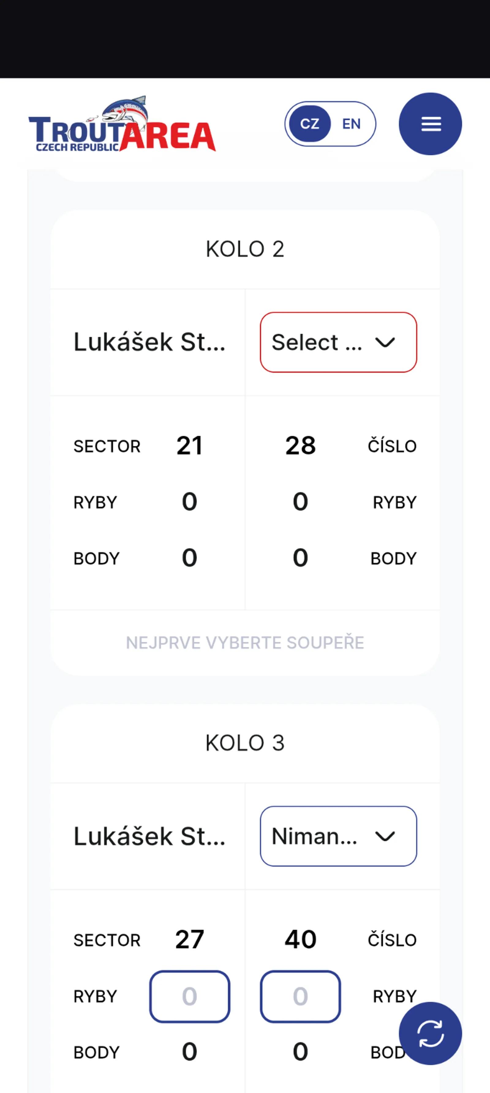 🇨🇿 Čeština Pokud nemáte přiděleného soupeře, musíte zvolit svého reálného soupeře. Například: Pokud lovíte na místě 21 a na místě 22 není soupeř, porovnáváte své výsledky se soupeřem na místě 20. Pokud lovíte na místě 22 a na místě 21 není soupeř, vaším soupeřem je místo 23 – tedy soused, který je vám při startu nejblíže. Pokud dojde k přerušení řetězce (například lovíte na místě 22 a soupeř 23 je na druhém břehu), znamená to, že porovnáváte výsledky s nejbližším dostupným soupeřem – v tomto případě s místem 20. Tato volba je označena červeně a zvýrazněna modrým pozadím. Vyberte skutečného soupeře, který je vám nejblíže, a zkontrolujte výsledky. --- 🇬🇧 English If you do not have an assigned opponent, you must choose your real opponent. For example: If you are fishing at position 21 and there is no opponent at position 22, you should compare your results with the competitor at position 20. If you are fishing at position 22 and there is no opponent at position 21, your opponent is position 23 — the neighbour who is closest to you at the start. If there is a break in the chain (for example you are fishing at position 22 and position 23 is on the opposite bank), you should compare your results with the nearest available competitor — in this case position 20. This option is marked in red and highlighted with a blue background. Select the real opponent closest to you and verify the result. --- 🇵🇱 Polski Jeżeli nie masz przypisanego przeciwnika, musisz wybrać swojego rzeczywistego przeciwnika. Na przykład: Jeśli łowisz na stanowisku 21 i na stanowisku 22 nie ma przeciwnika, porównujesz swoje wyniki z zawodnikiem na stanowisku 20. Jeśli łowisz na stanowisku 22 i na stanowisku 21 nie ma przeciwnika, twoim przeciwnikiem jest stanowisko 23 — czyli sąsiad najbliżej ciebie w momencie startu. Jeżeli nastąpi przerwanie ciągu (na przykład łowisz na stanowisku 22, a zawodnik z 23 jest na drugim brzegu), oznacza to, że porównujesz wyniki z najbliższym dostępnym zawodnikiem — w tym przypadku ze stanowiskiem 20. Ten wybór jest oznaczony na czerwono i podświetlony niebieskim tłem. Wybierz rzeczywistego przeciwnika najbliżej ciebie i sprawdź wynik. --- 🇺🇦 Українська Якщо у вас немає призначеного суперника, ви повинні обрати реального суперника. Наприклад: Якщо ви ловите на місці 21, а на місці 22 немає суперника, ви порівнюєте свій результат із суперником на місці 20. Якщо ви ловите на місці 22, а на місці 21 немає суперника, вашим суперником є місце 23 — тобто сусід, який знаходиться найближче до вас під час старту. Якщо виникає розрив у ланцюгу (наприклад, ви ловите на місці 22, а 23 знаходиться на іншому березі), це означає, що потрібно порівнювати результат з найближчим доступним суперником — у цьому випадку з місцем 20. Цей вибір позначений червоним кольором і підсвічений синім фоном. Оберіть реального суперника, який знаходиться найближче до вас, і перевірте результат.