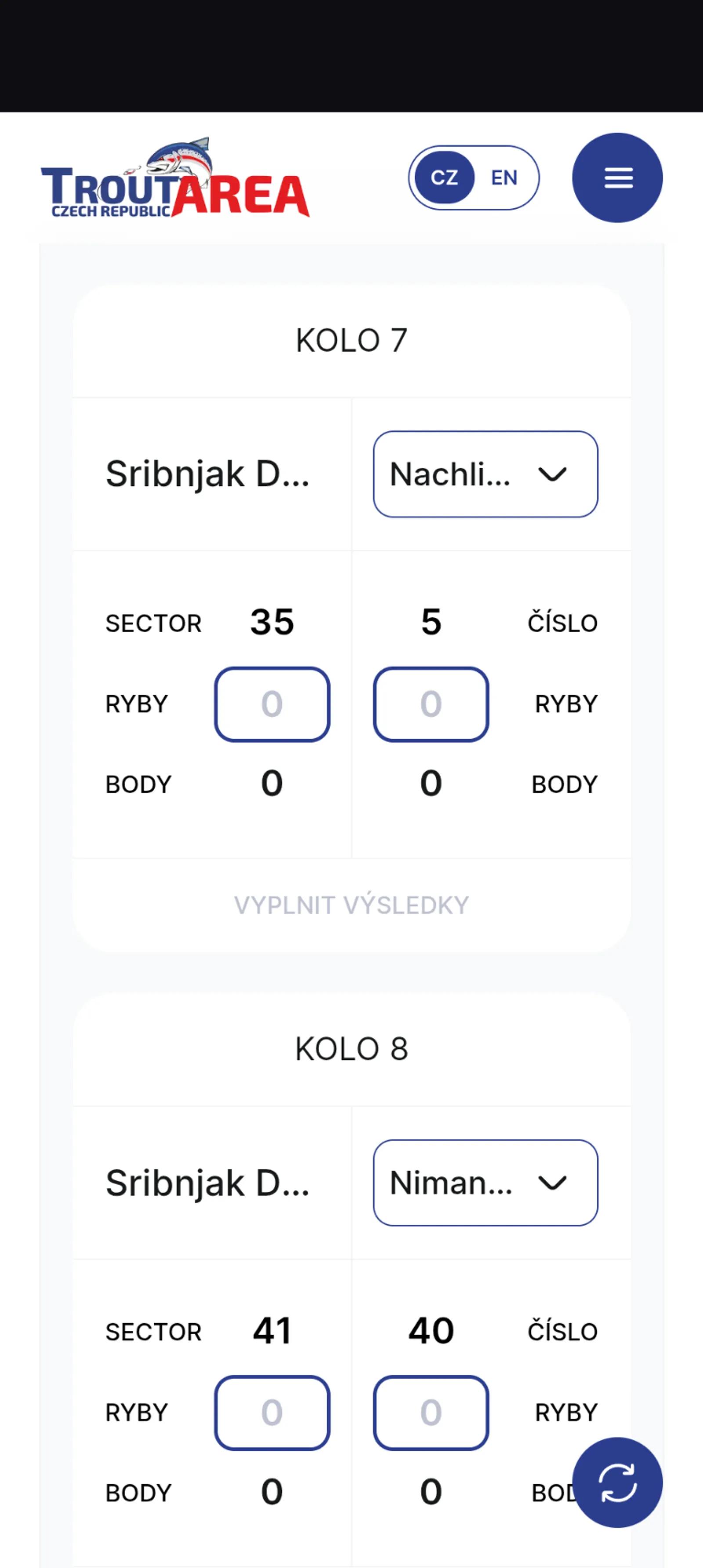 🇨🇿 Čeština Pokud máte problém s telefonem, zapisujte své výsledky na papírovou kartu. Prázdné karty si můžete vyzvednout před začátkem turnaje. Pokud kartu nemáte, stačí zapsat číslo kola, počet vašich ryb a počet ryb soupeře. Administrátor tyto výsledky doplní po skončení turnaje ručně. --- 🇬🇧 English If you have a problem with your phone, write your results on a paper score card. Blank cards can be taken before the start of the tournament. If you do not have a card, it is enough to write the round number, your fish and your opponent’s fish. The administrator will enter the results manually at the end of the tournament. --- 🇵🇱 Polski Jeśli masz problem z telefonem, zapisz swoje wyniki na papierowej karcie. Puste karty można odebrać przed rozpoczęciem turnieju. Jeśli nie masz karty, wystarczy zapisać numer tury, liczbę Twoich ryb oraz liczbę ryb przeciwnika. Administrator uzupełni wyniki ręcznie po zakończeniu turnieju. --- 🇺🇦 Українська Якщо у вас виникли проблеми з телефоном, записуйте результати на паперову картку. Порожні картки можна отримати перед початком турніру. Якщо у вас немає картки, достатньо записати номер туру, кількість ваших риб та кількість риб суперника. Адміністратор внесе результати вручну після завершення турніру.